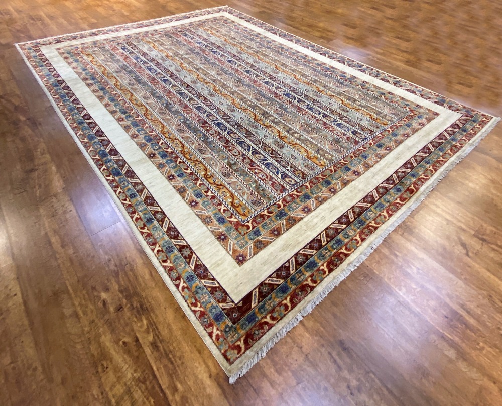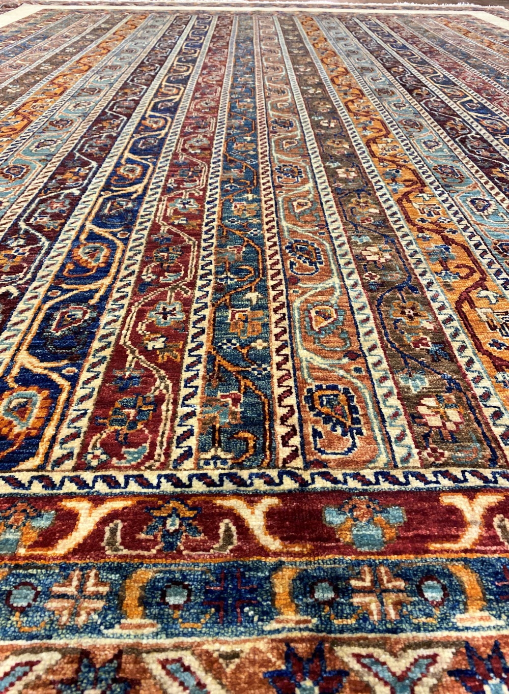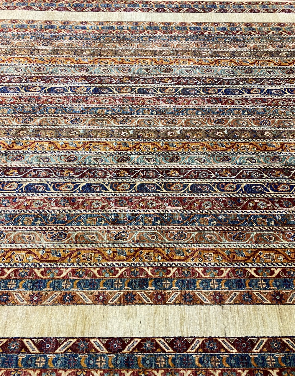 Ковры этой коллекции выполнены в этнической стилистике. Локальные бирюзовые, терракотовые, зеленые полосы перемежаются с орнаментальными бордюрами, изобразительный ряд которых в примитивной форме отражает самые главные для человека символы: солнце, звезды, небо, воду, землю…