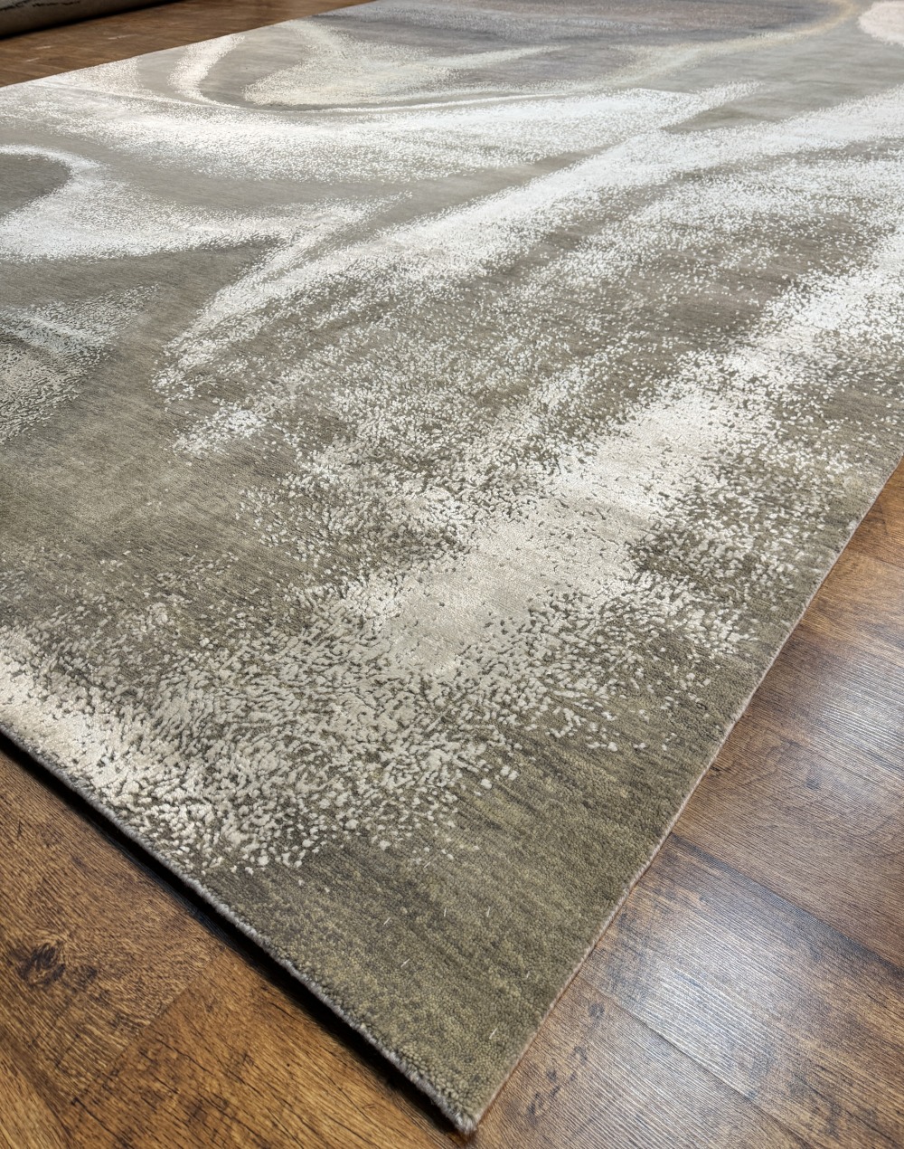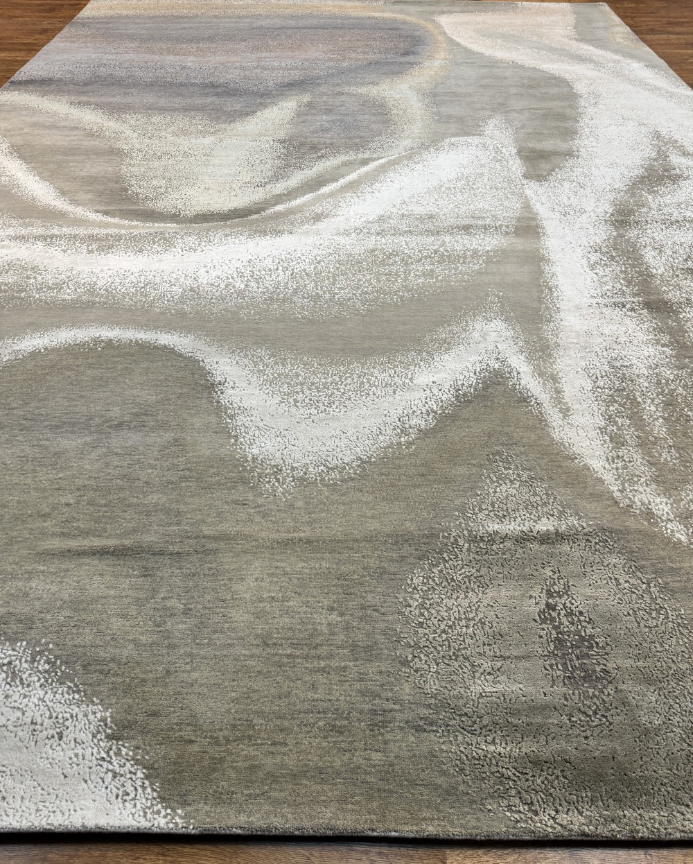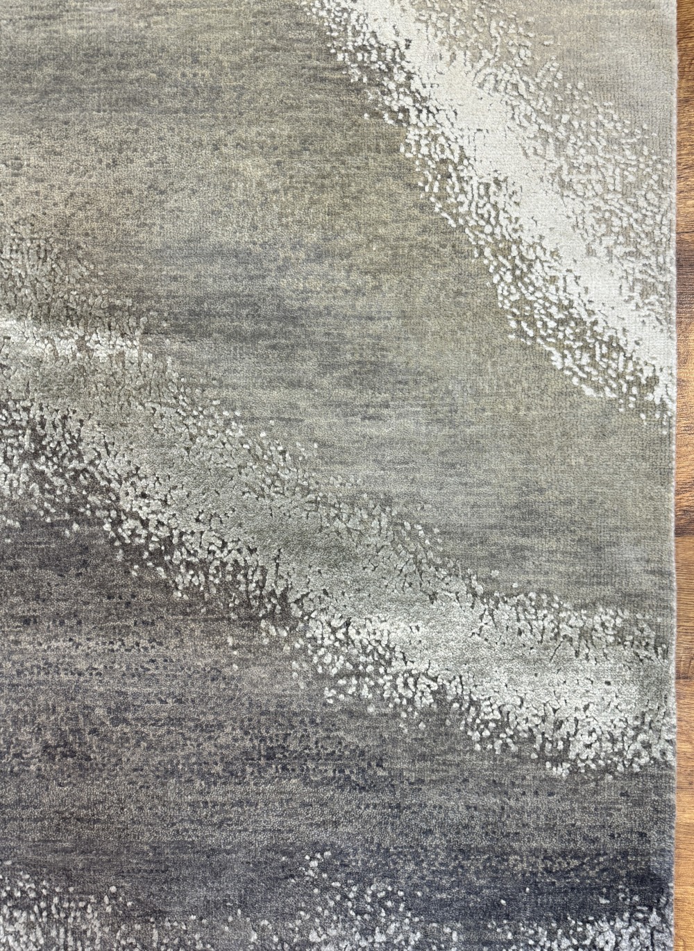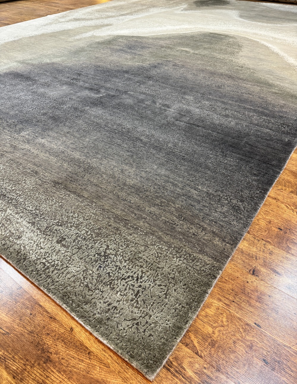 Ковер изготовленный из 100 % новозеландской шерсти и мерцающего шёлка, сочетает в себе тёплые и холодные оттенки серого с успокаивающими тонами жемчужного отенка. Его геометрический узор в стиле ар-деко придаёт помещению сдержанную изысканность, современную элегантность и безмятежную атмосферу.
