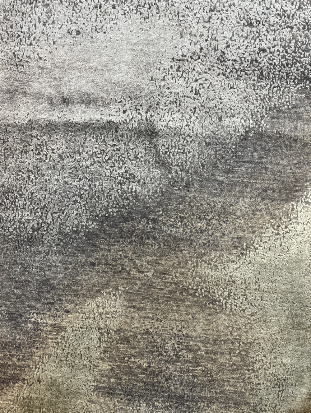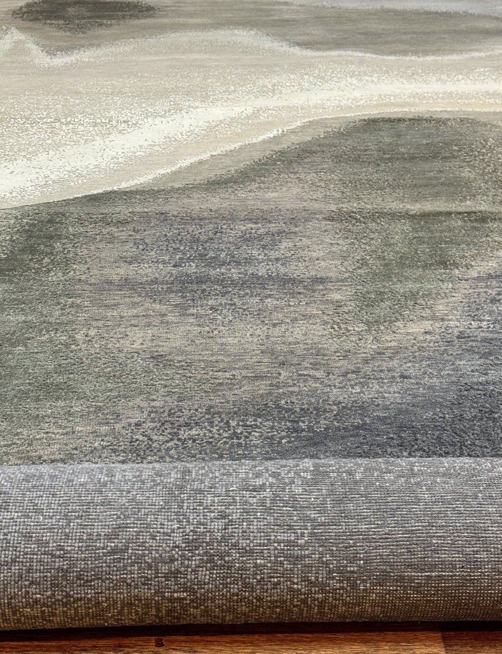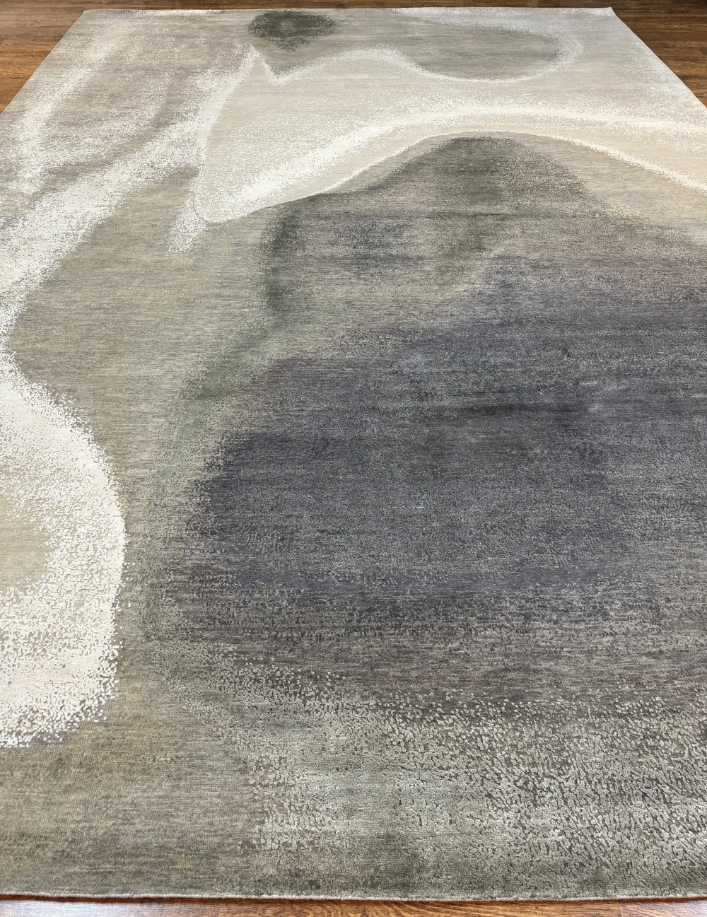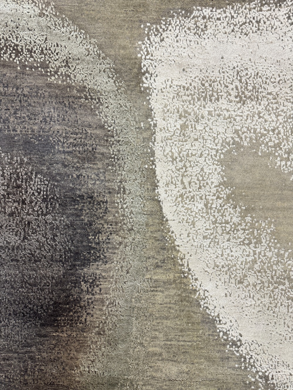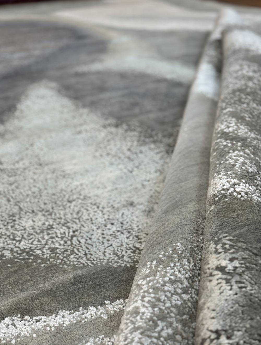 Ковер изготовленный из 100 % новозеландской шерсти и мерцающего шёлка, сочетает в себе тёплые и холодные оттенки серого с успокаивающими тонами жемчужного отенка. Его геометрический узор в стиле ар-деко придаёт помещению сдержанную изысканность, современную элегантность и безмятежную атмосферу.