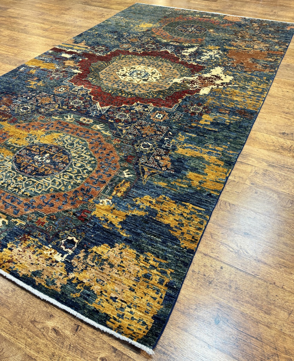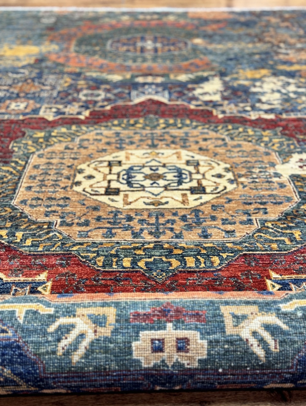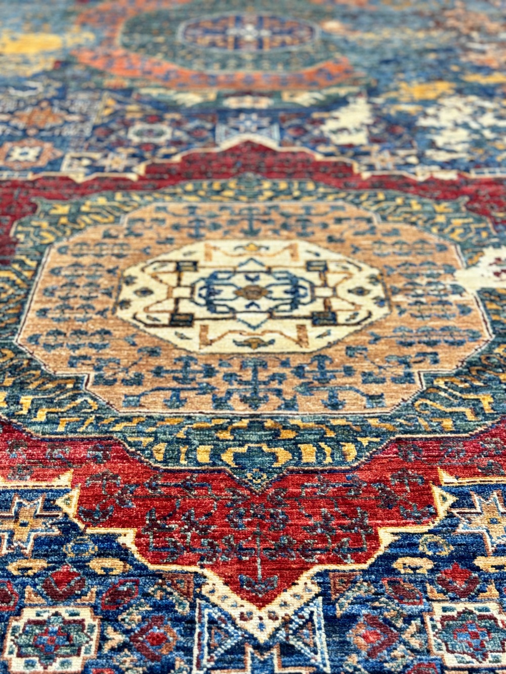 Дизайн ковра довольно сложный и отличающиеся обилием крупных сложных медальонов шести и восьмиугольной формы, остальное поле ковра заполнено сложными геометрическими орнаментами, подобно калейдоскопу.