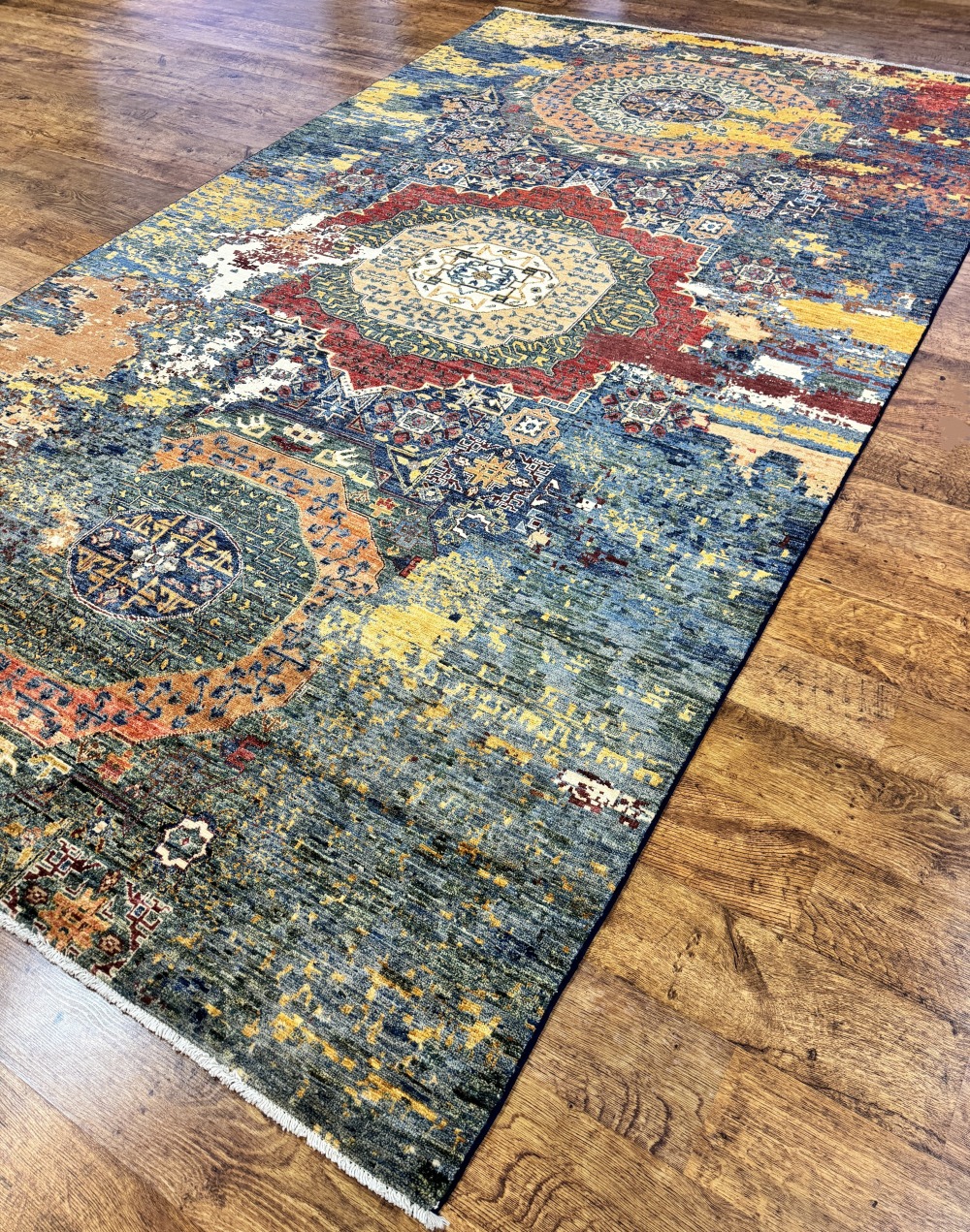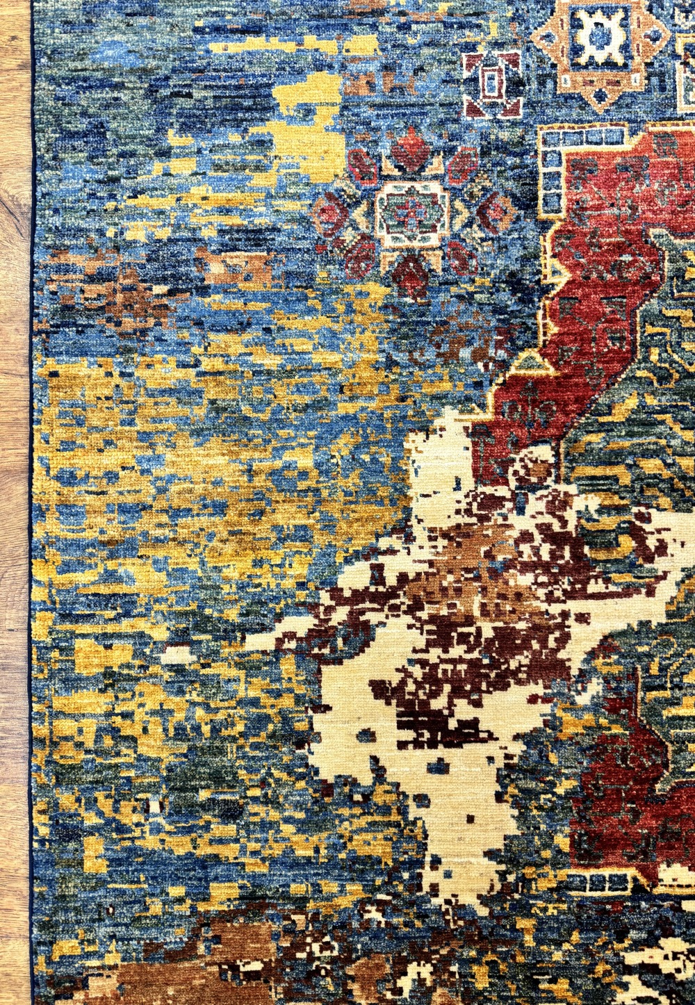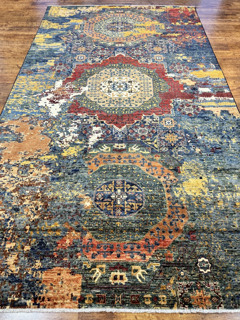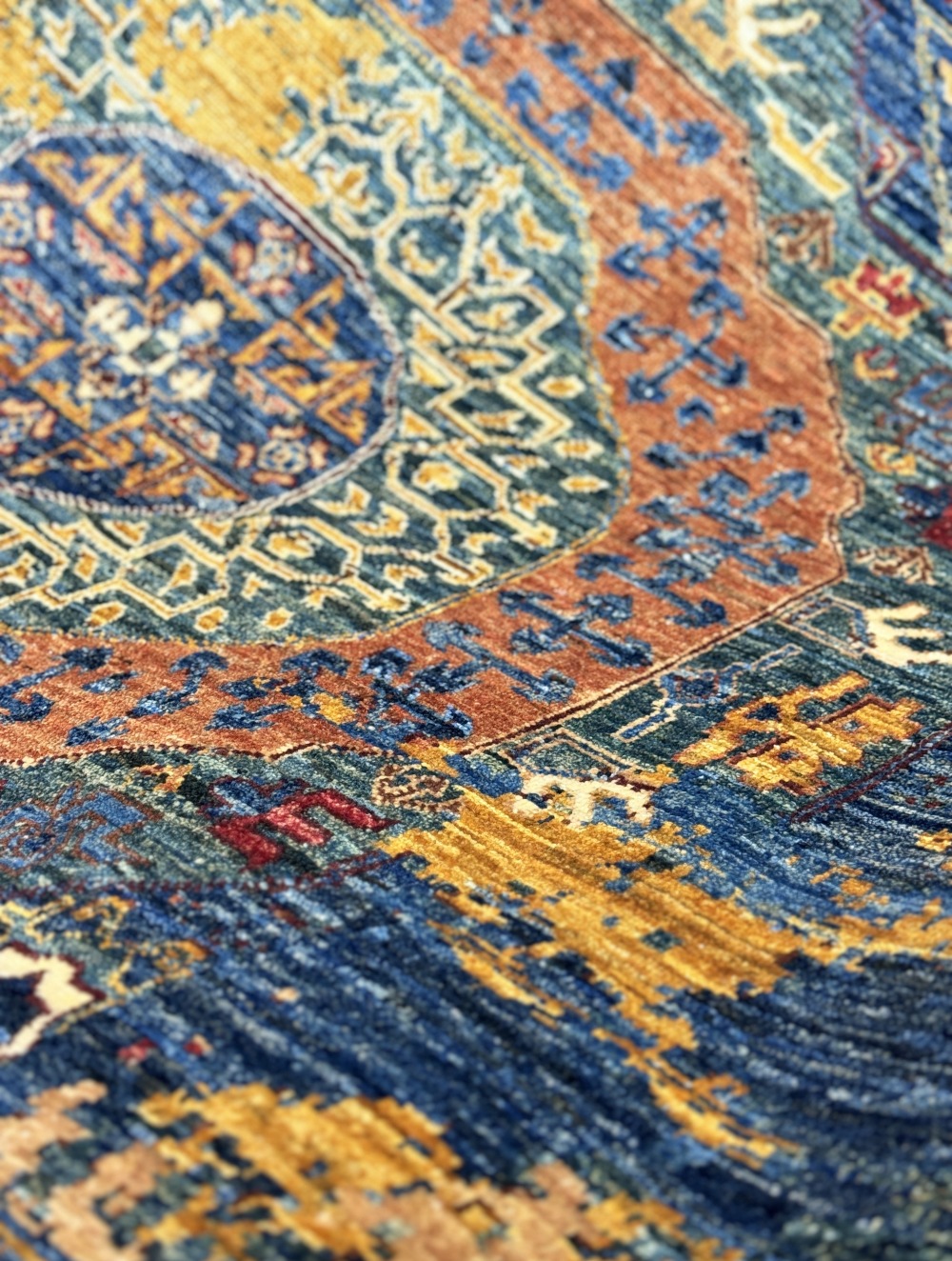 Дизайн ковра довольно сложный и отличающиеся обилием крупных сложных медальонов шести и восьмиугольной формы, остальное поле ковра заполнено сложными геометрическими орнаментами, подобно калейдоскопу.