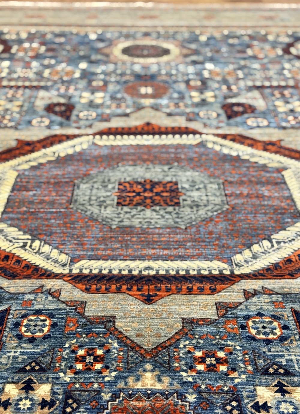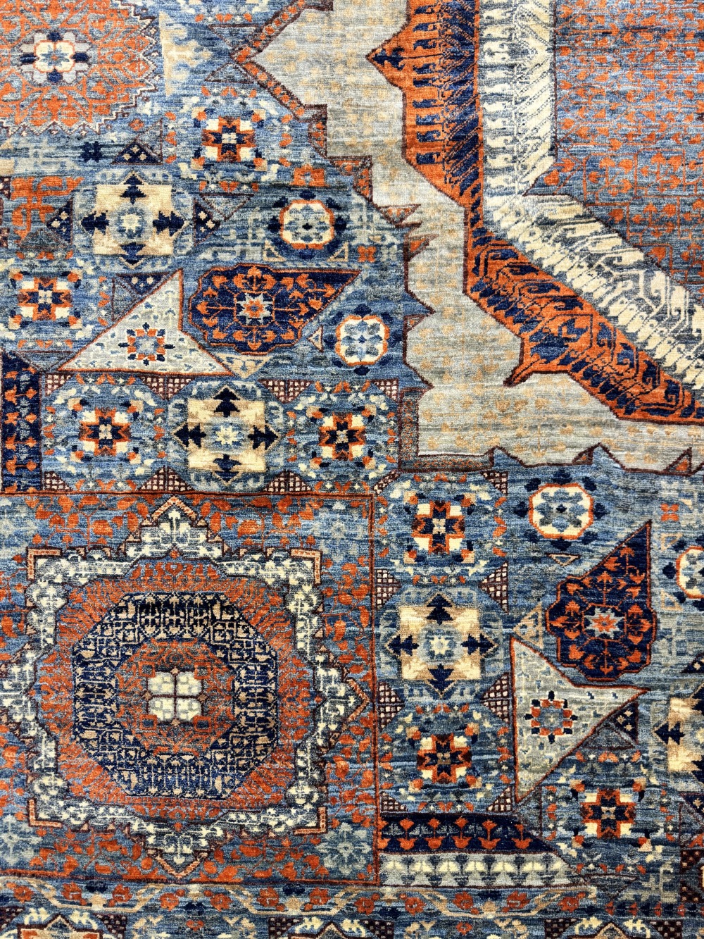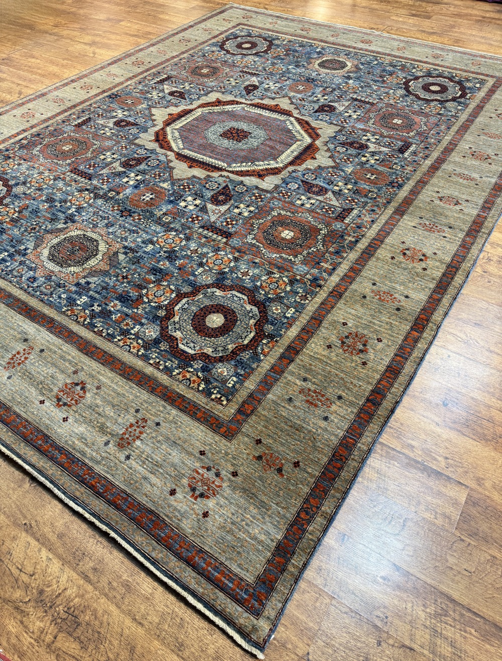 Дизайн ковра довольно сложный и отличающиеся обилием крупных сложных медальонов шести и восьмиугольной формы, остальное поле ковра заполнено сложными геометрическими орнаментами, подобно калейдоскопу.