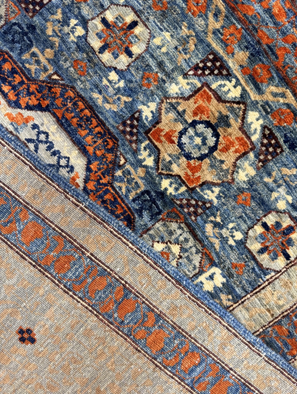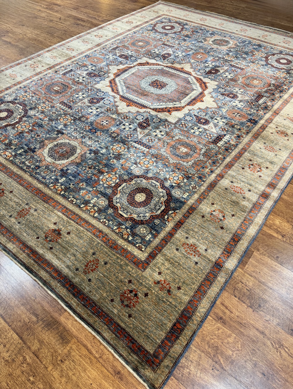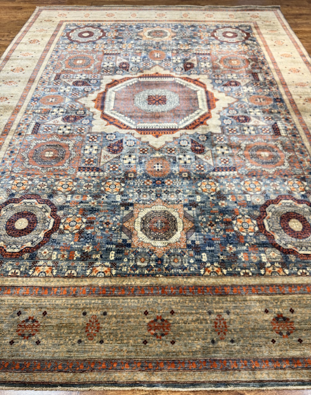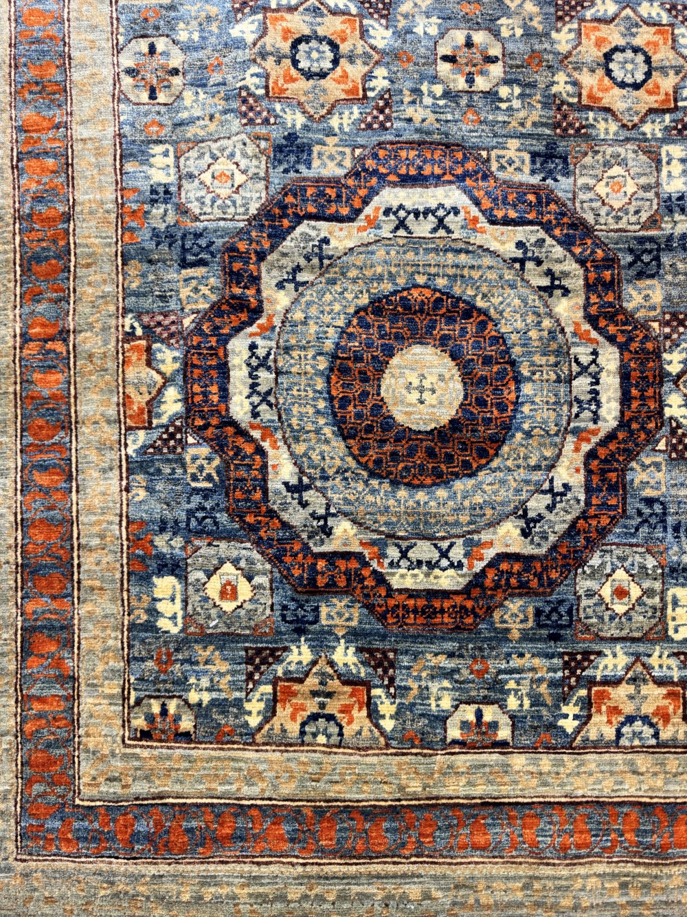 Дизайн ковра довольно сложный и отличающиеся обилием крупных сложных медальонов шести и восьмиугольной формы, остальное поле ковра заполнено сложными геометрическими орнаментами, подобно калейдоскопу.